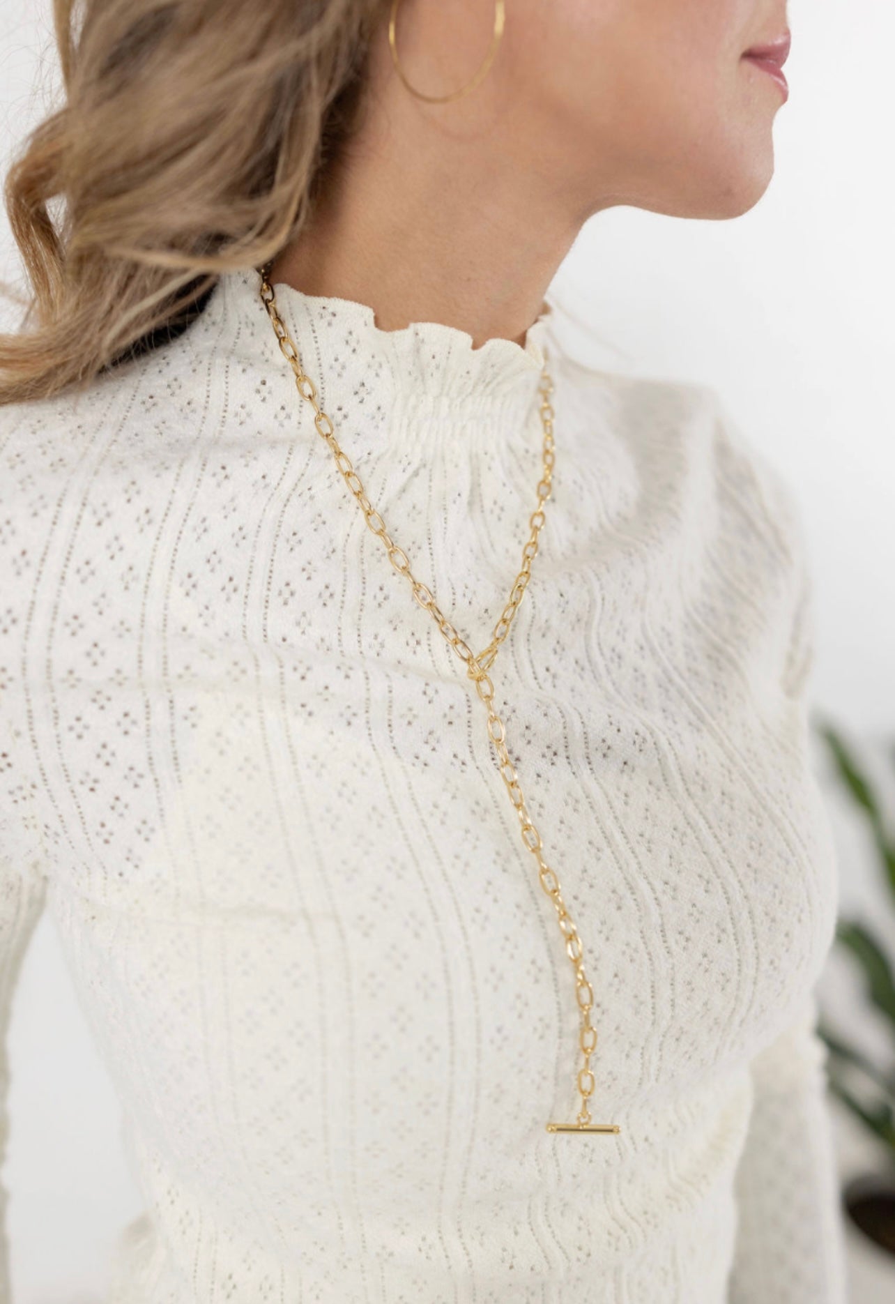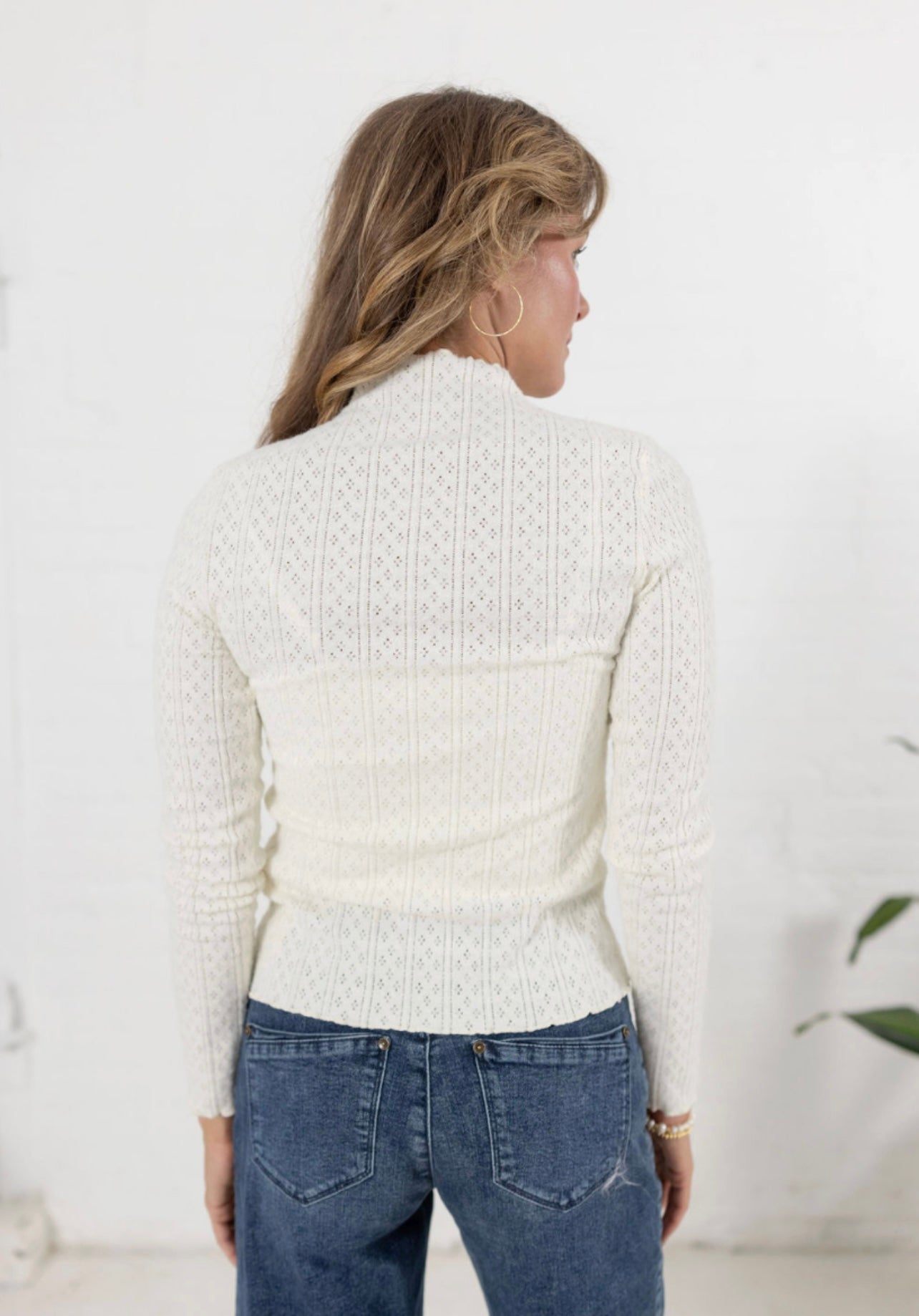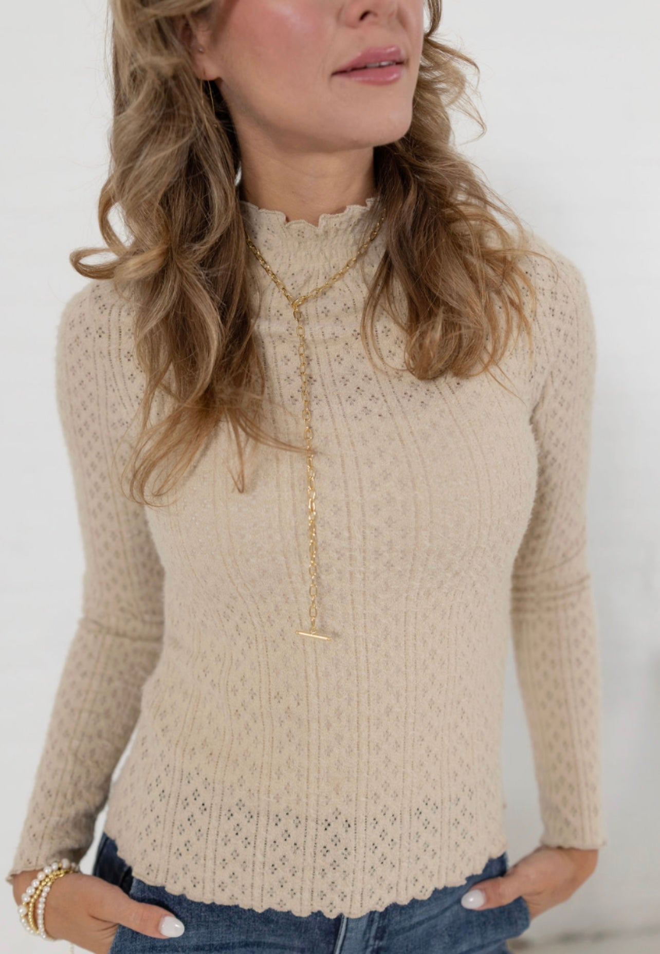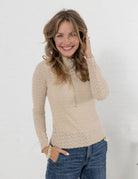 The Diamond Eyelet Lettuce Edge Top is the perfect blend of flirty and polished! With its allover eyelet texture, delicate lettuce-edge trim, and cinched front neckline, this fitted mock-neck top brings feminine charm to any outfit. It’s soft, stretchy, and ideal for layering or standing out on its own.