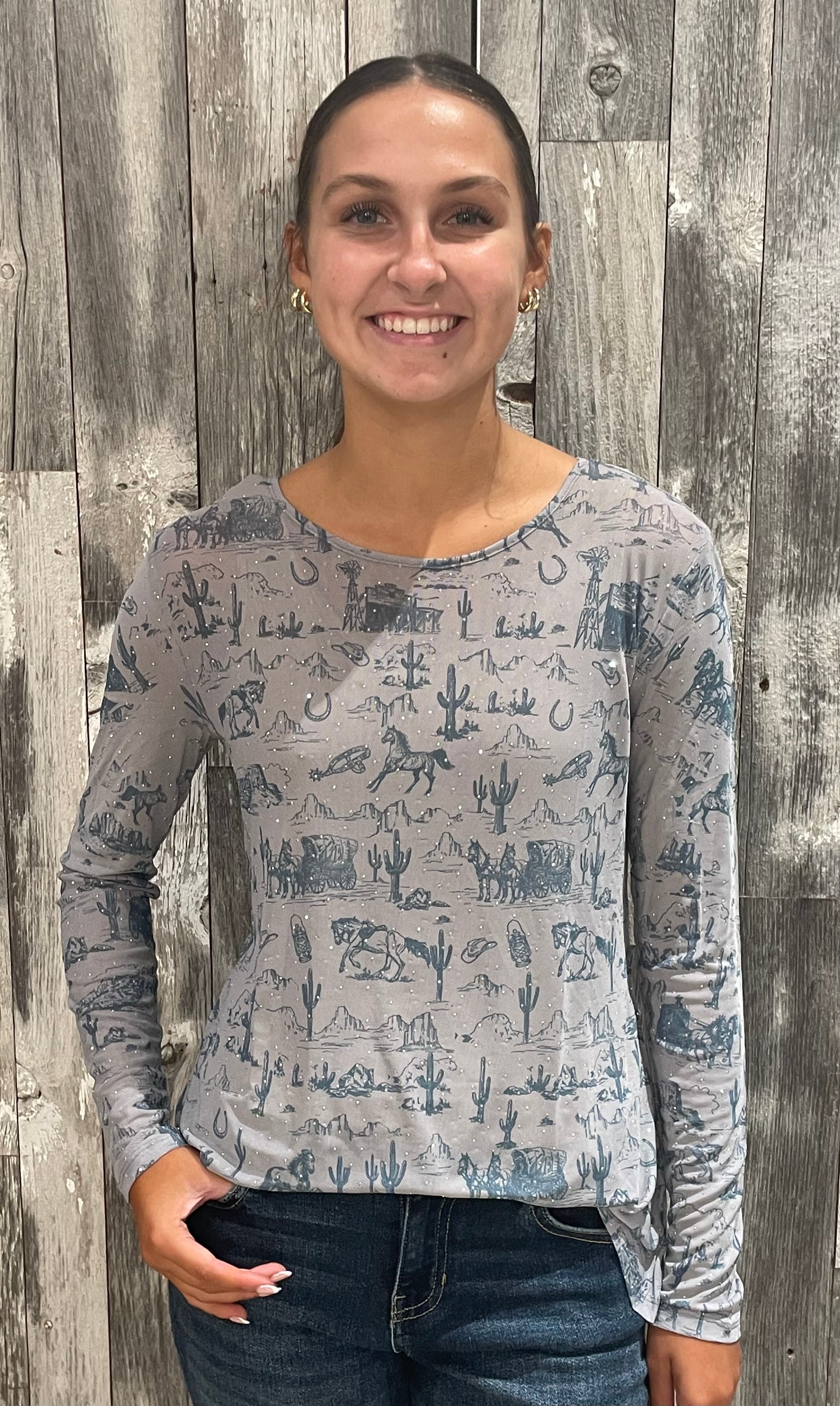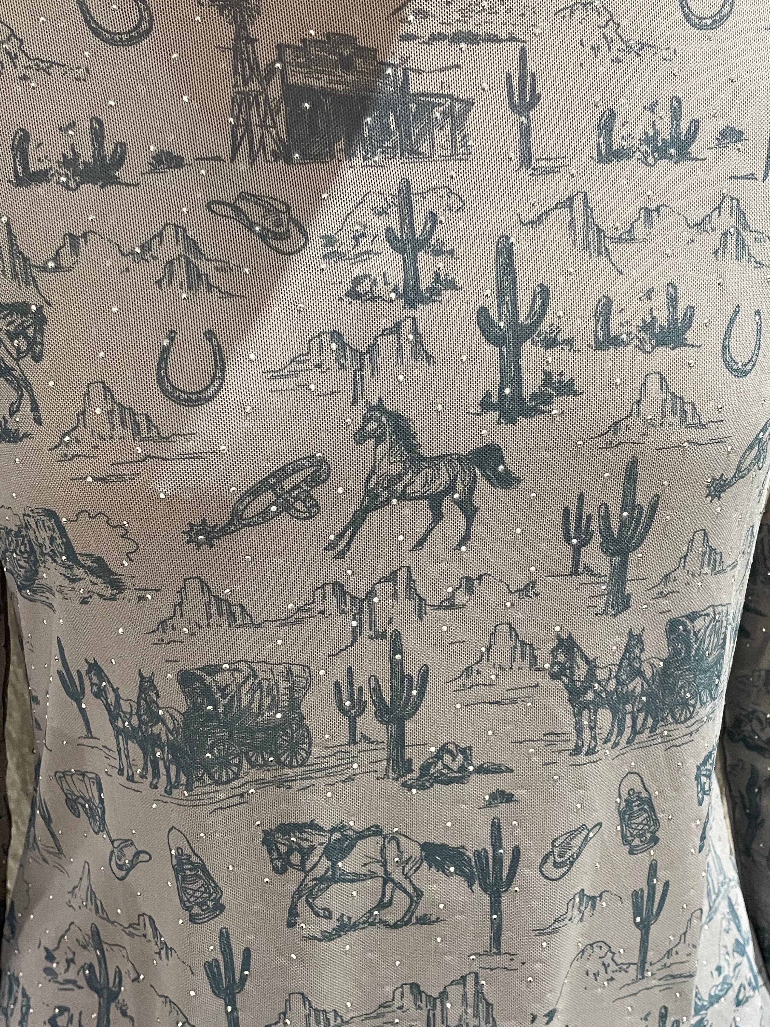Western-inspired allover print featuring horses, cacti, windmills, and desert scenery