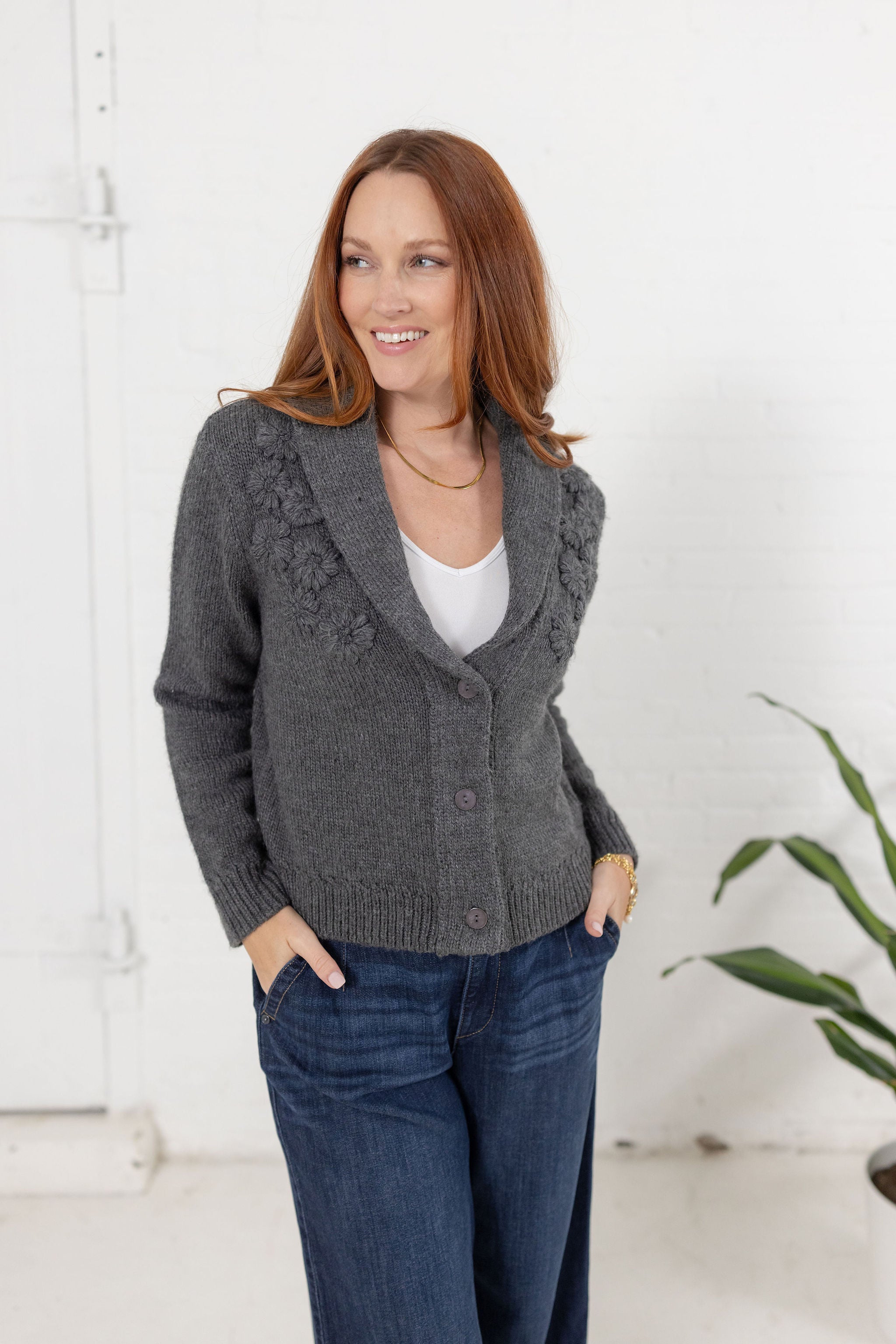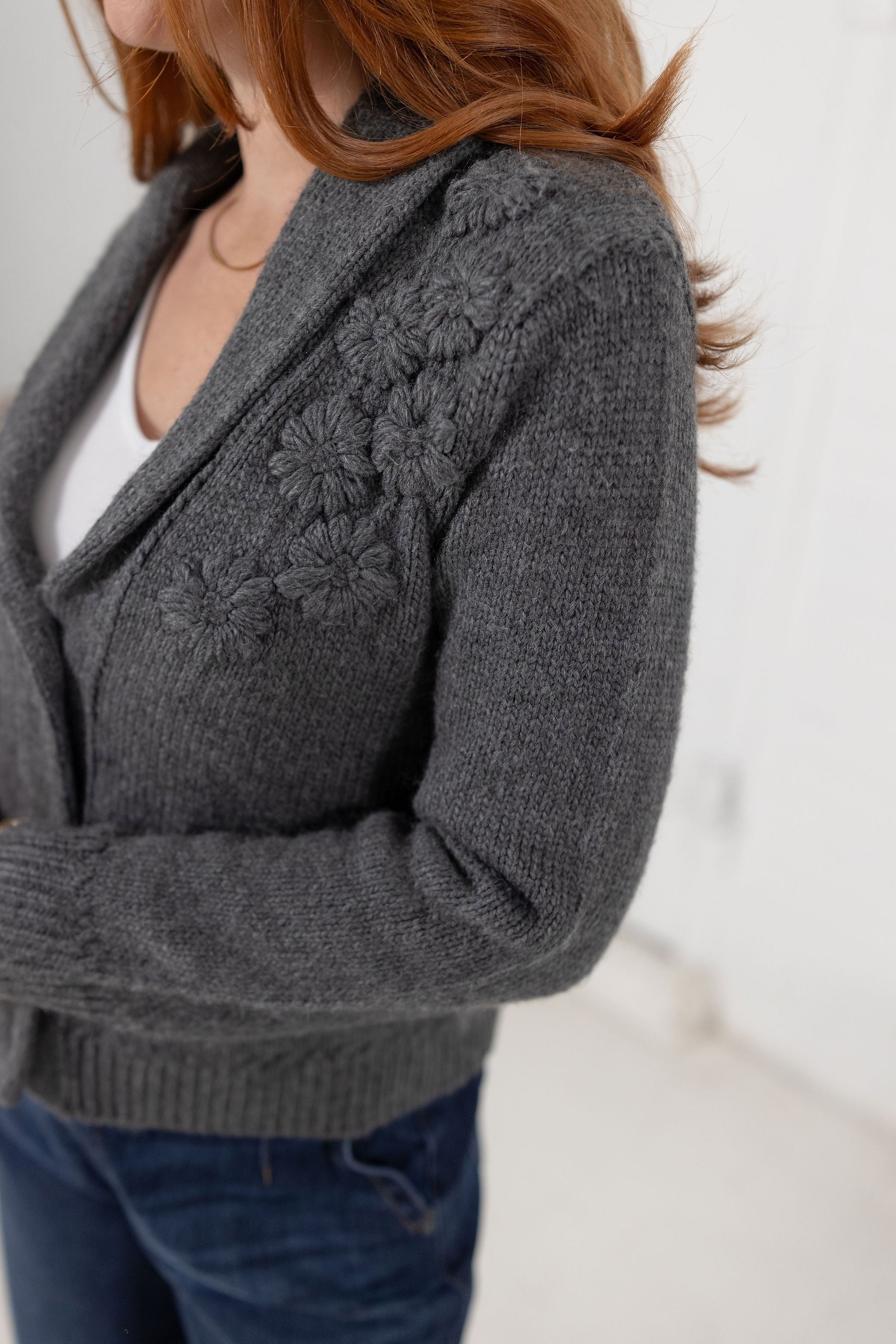 • Floral knit appliqué detail along the shoulders adds texture and charm