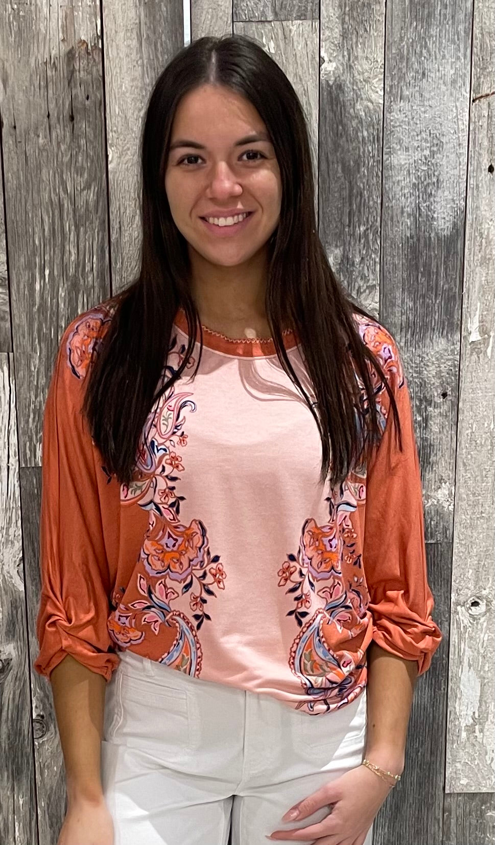 This easy, eye-catching top blends rich color with an artful print for a look that feels both relaxed and elevated. The soft peachy center panel is framed by warm rust-toned sleeves and intricate floral-inspired detailing, creating a flattering, balanced design. Lightweight with a comfortable drape, it’s an effortless piece you can dress up or down.