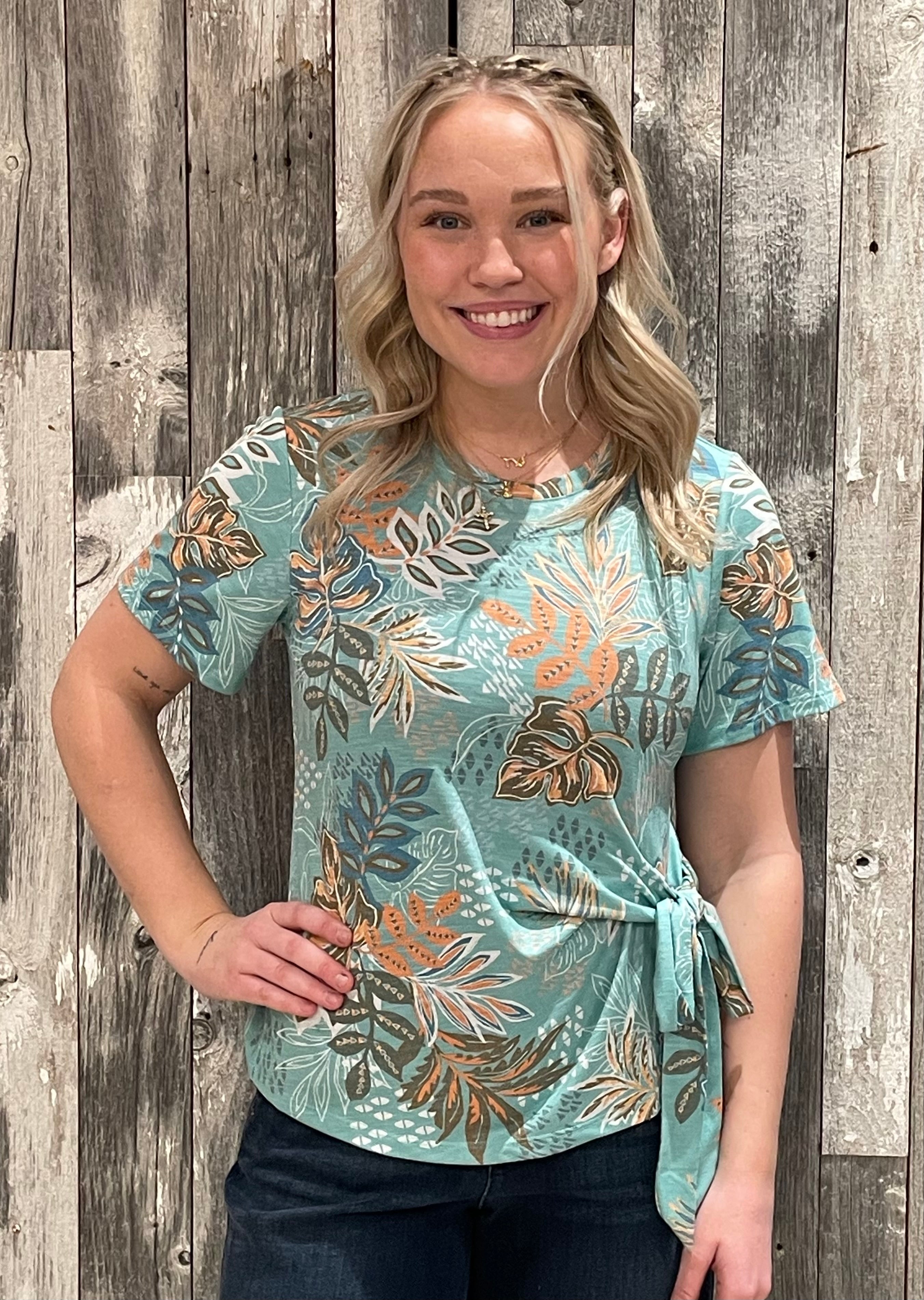 This tropical-inspired top brings effortless style to your everyday wardrobe. Designed with an allover leaf print and a soft, lightweight feel, it features a side tie detail that creates a flattering, adjustable silhouette. Easy to wear and easy to love.