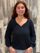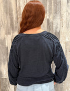 Sleeves: Long balloon sleeves with vertical rib/pintuck detail; ribbed cuffs