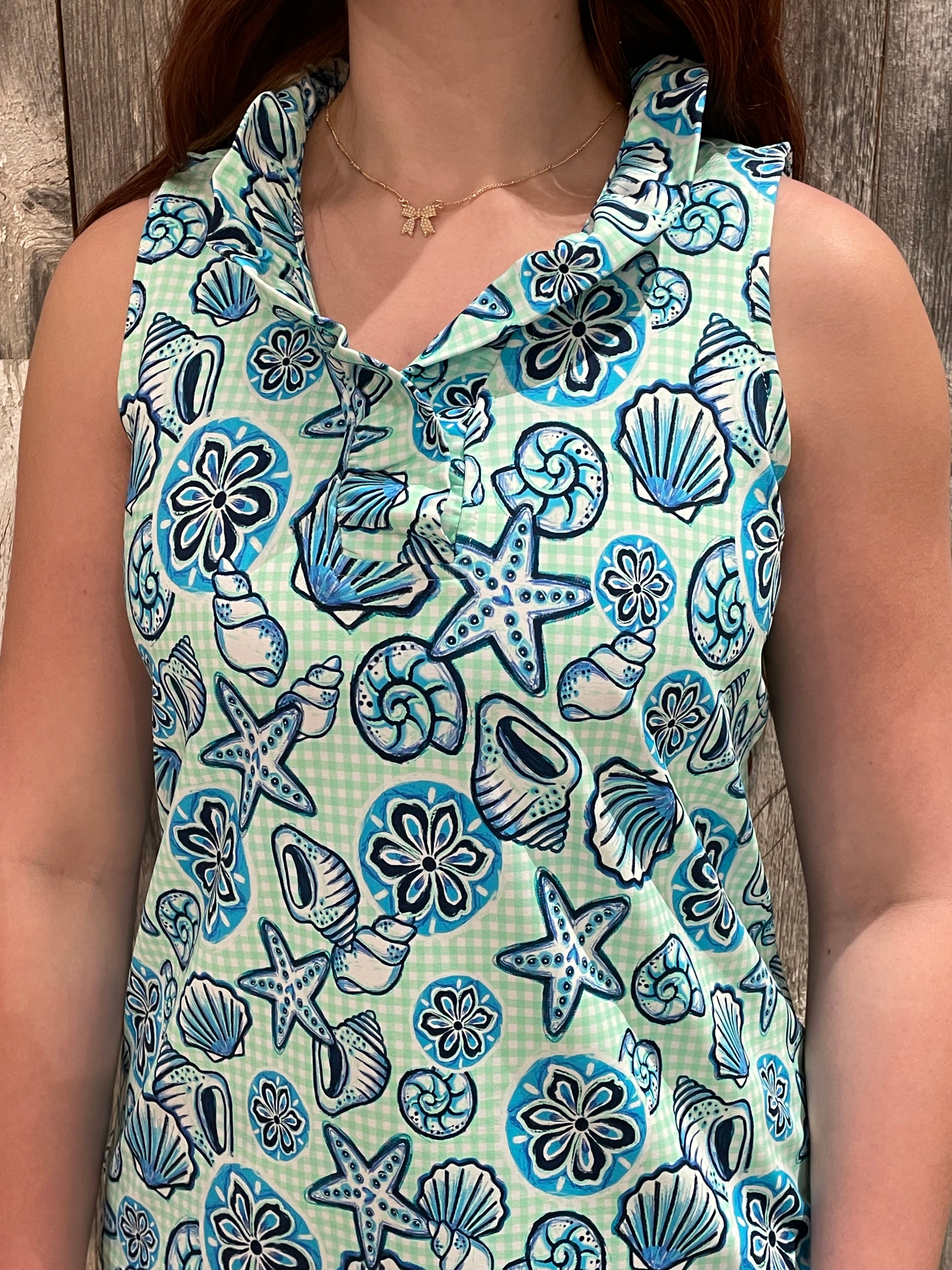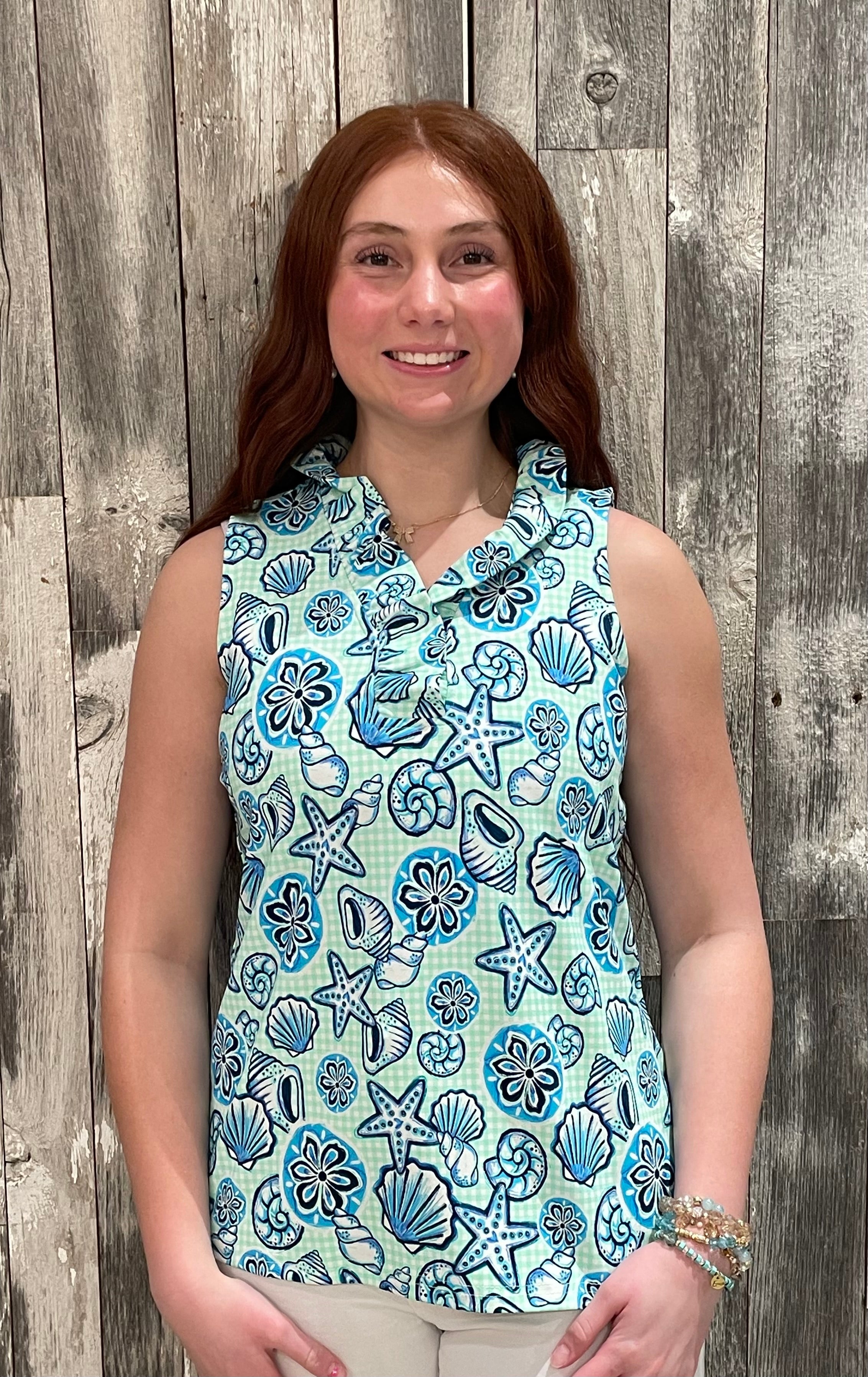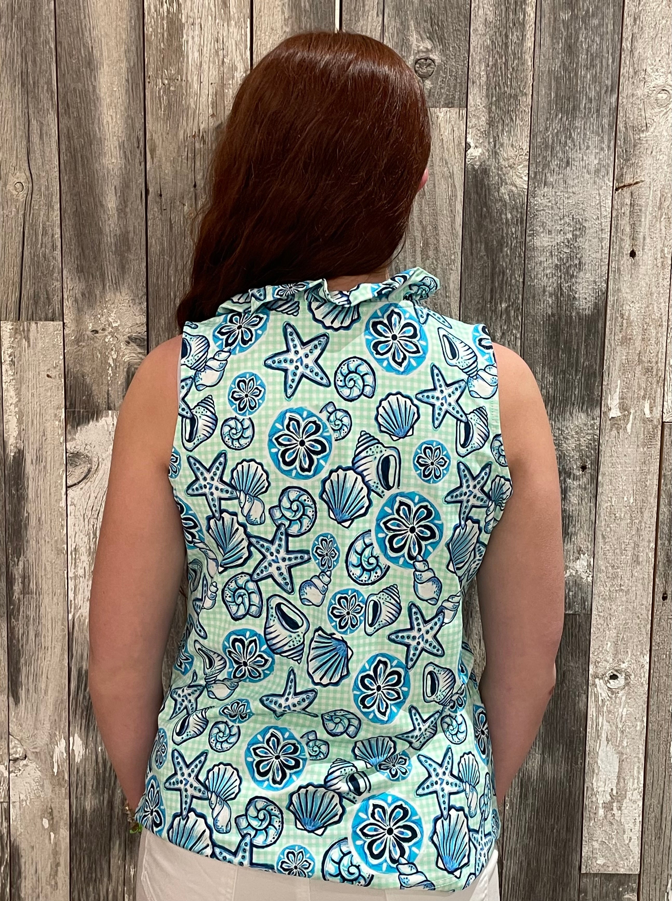 This sleeveless top is a warm-weather favorite with a fun, beachy twist. Covered in a playful coastal-inspired print with shells and starfish, it brings fresh color and personality to an easy, wearable silhouette. The lightweight feel and relaxed fit make it perfect for sunny days, vacations, or casual everyday plans.