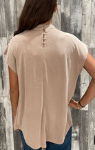 Style: Draped mock-neck top