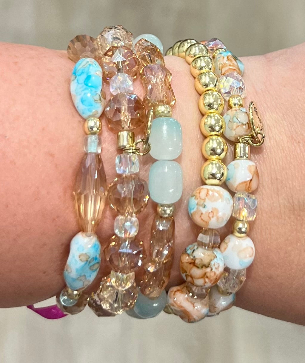 - Experience the perfect balance of soft earth tones and refreshing mint hues with our Bushels Stack. This versatile bracelet stack adds a touch of natural beauty to any outfit. Elevate your accessory game with this must-have essential.