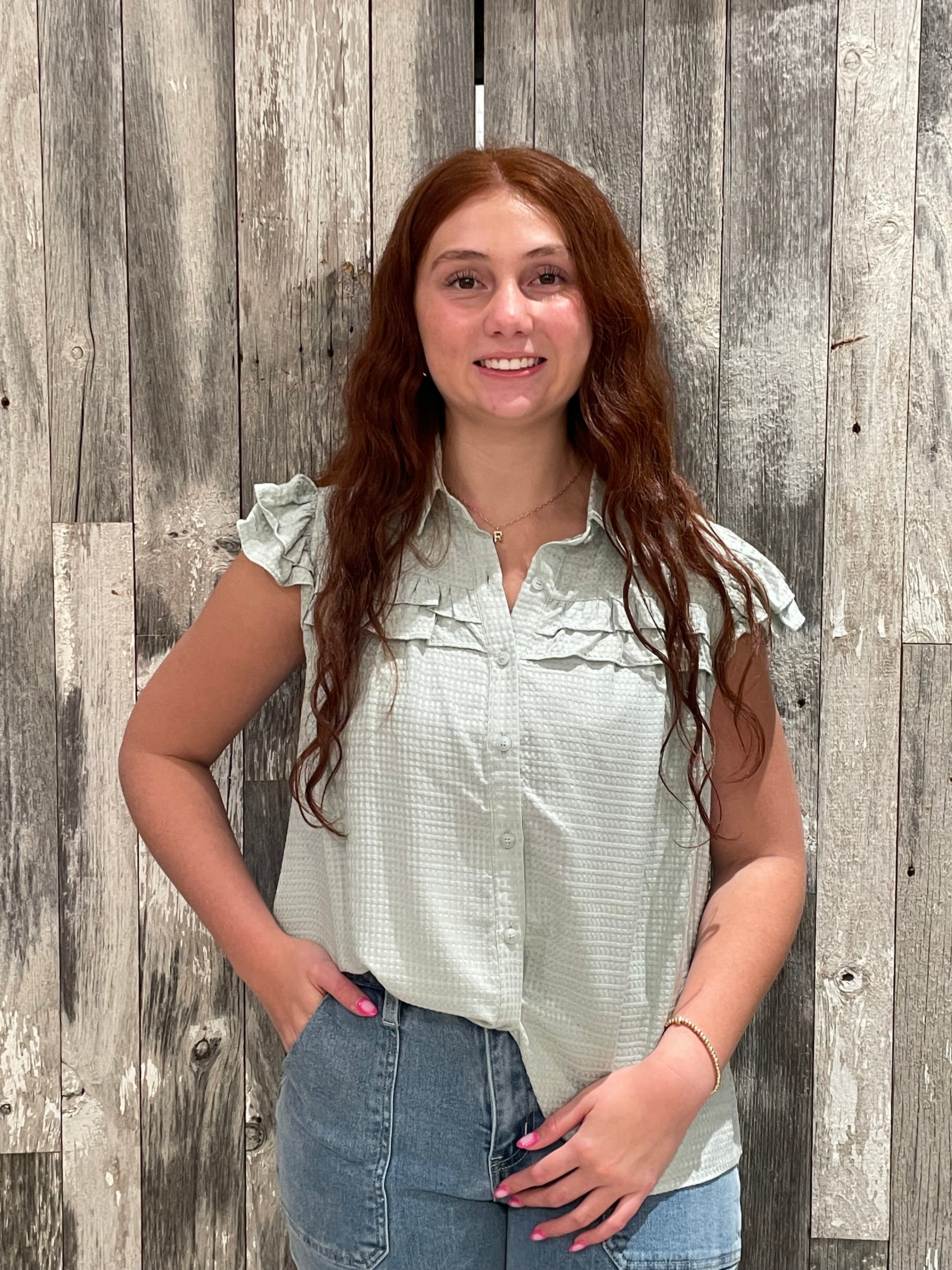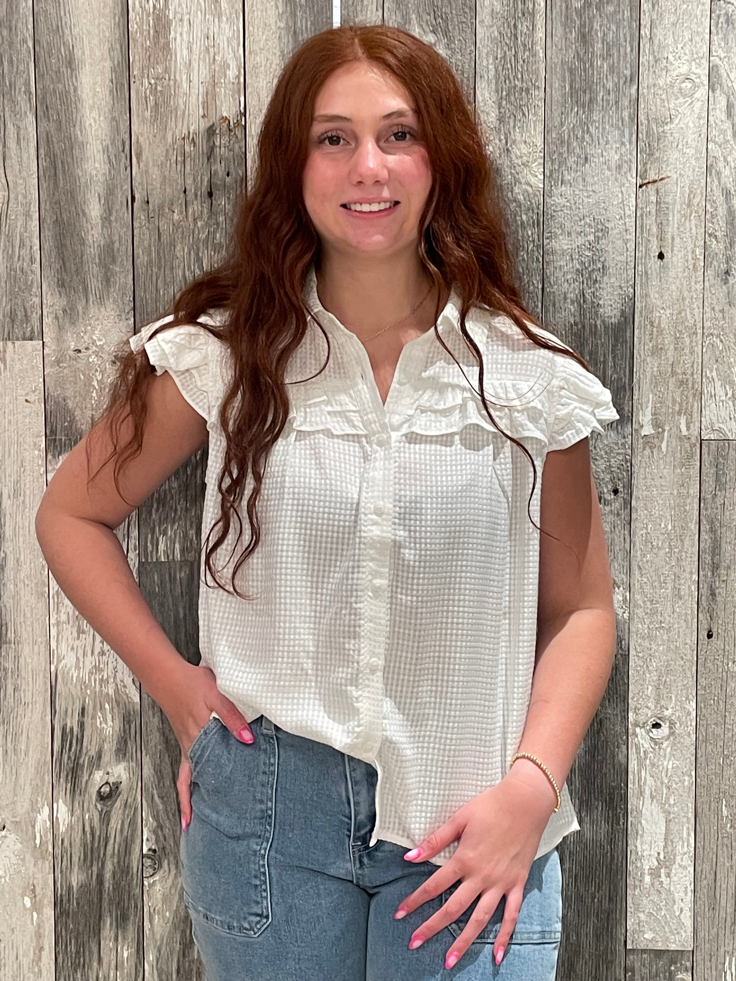 Double Ruffle Cap Sleeve Front Button Down Blouse