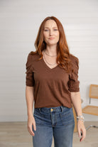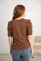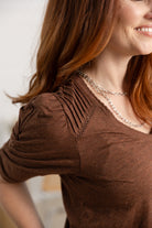 Sleeves: Short puff sleeves with pleated shoulders and subtle ruching