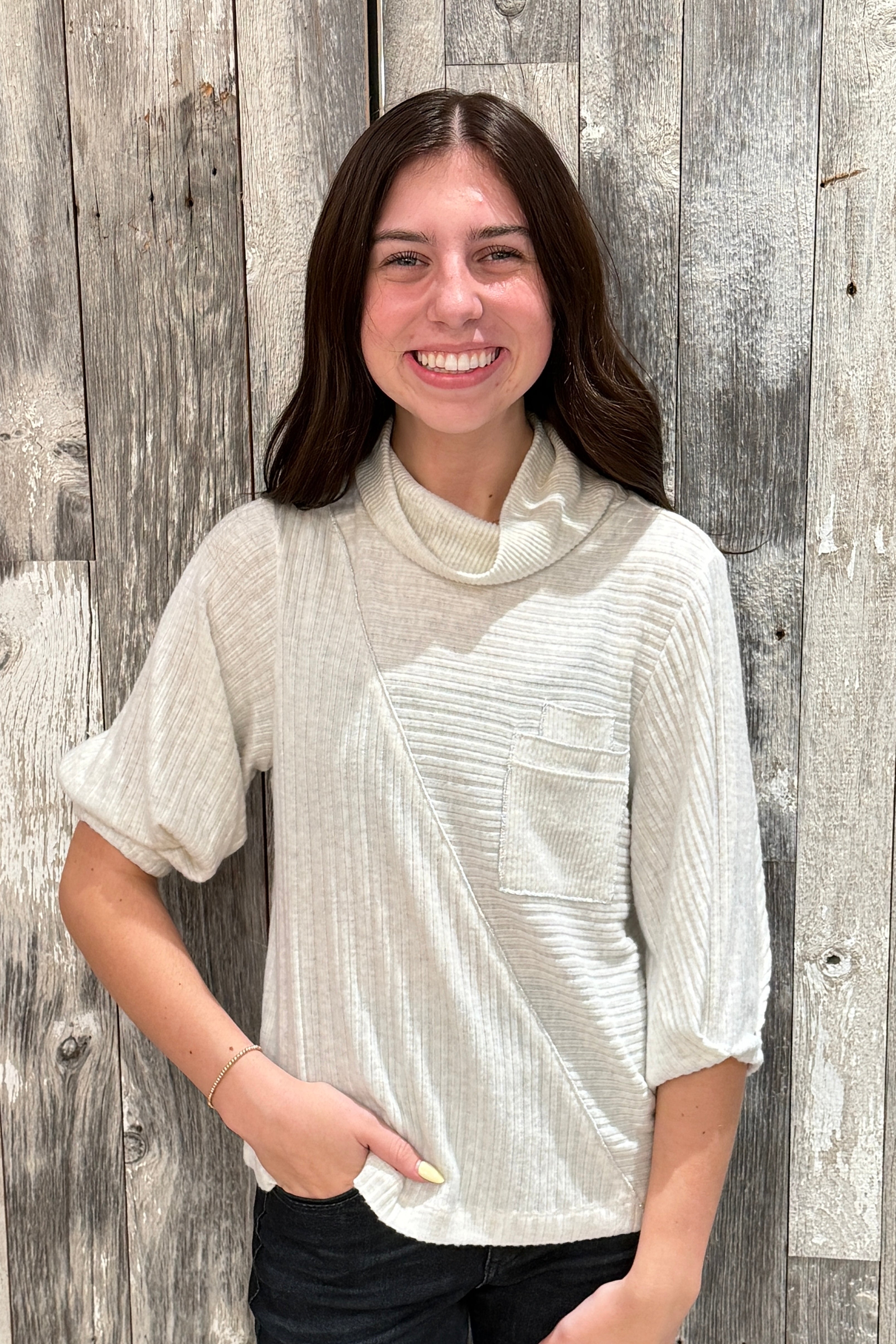 Details: Front chest patch pocket and diagonal pieced seam for interest