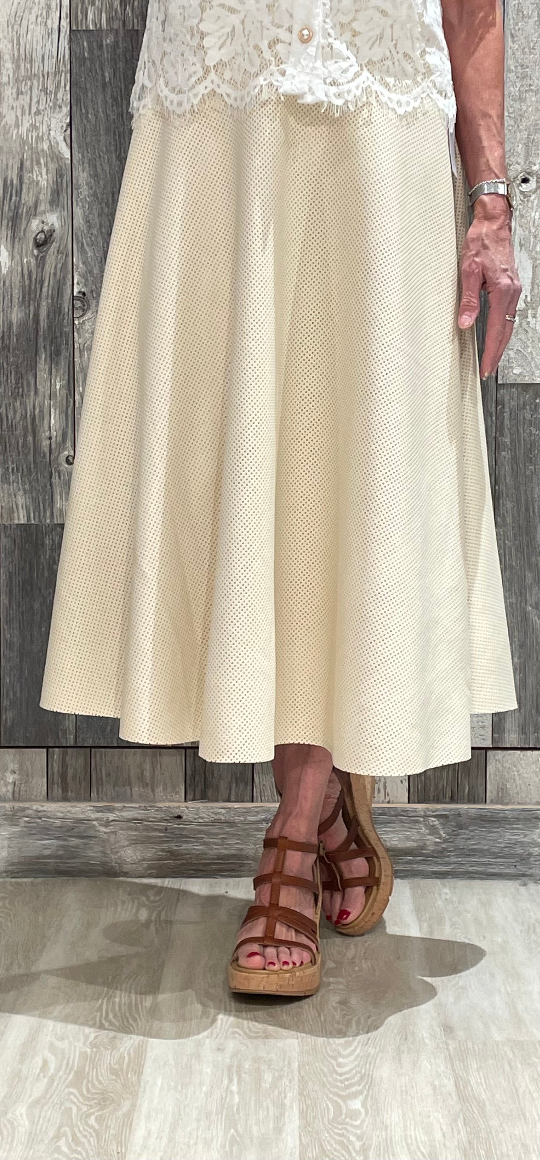 The Faux Leather Perforated Midi Skirt offers a modern take on a classic silhouette with eye-catching texture.