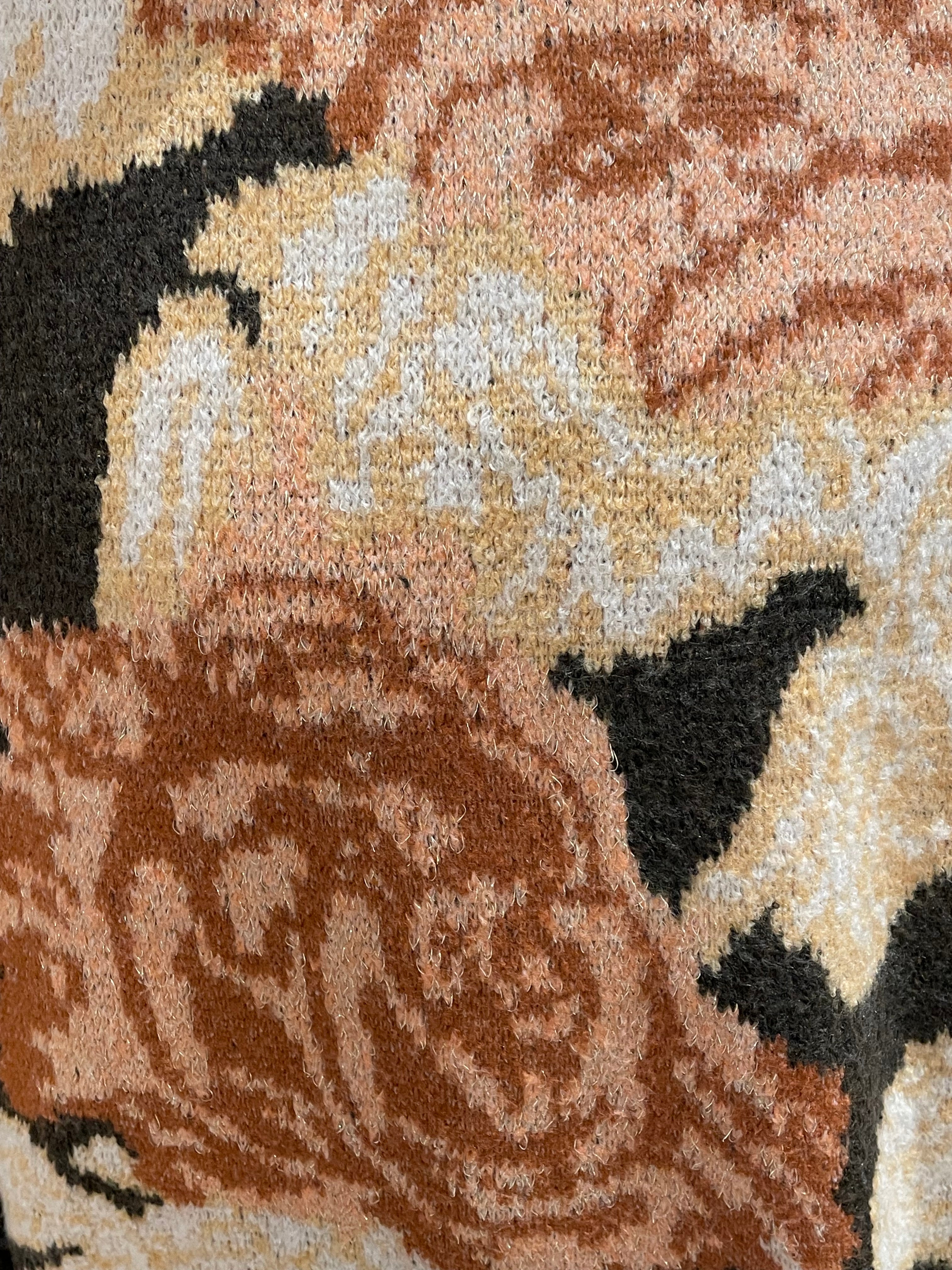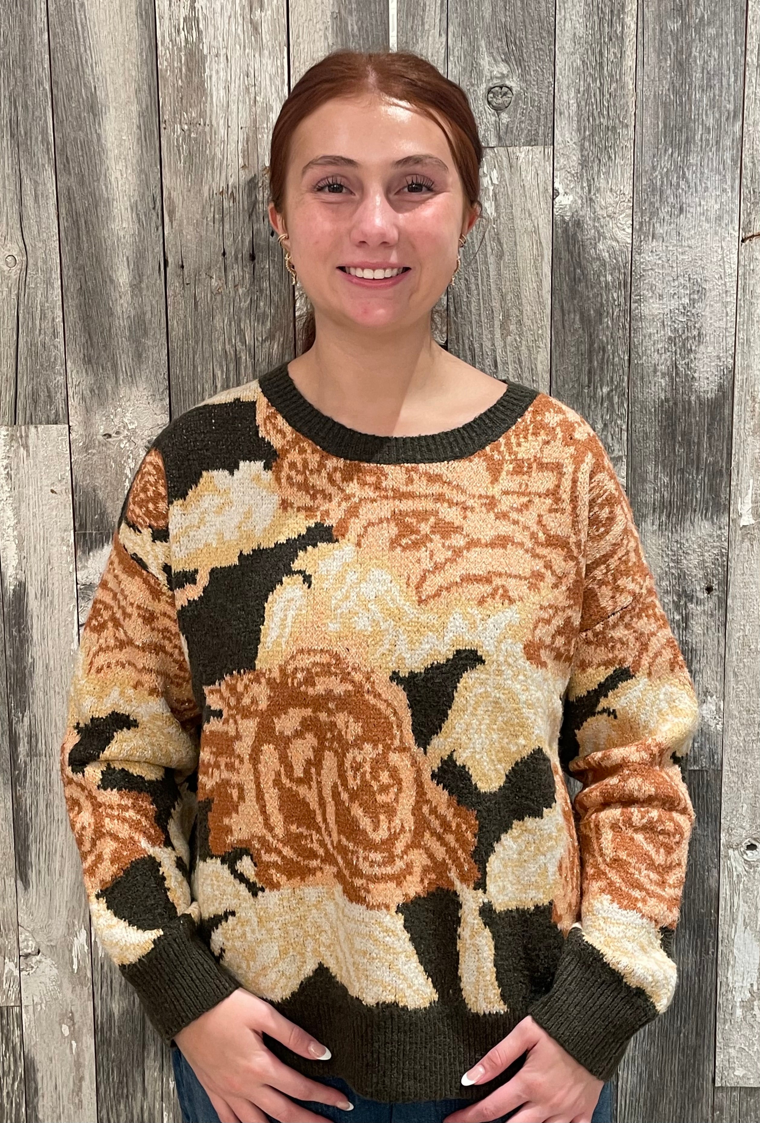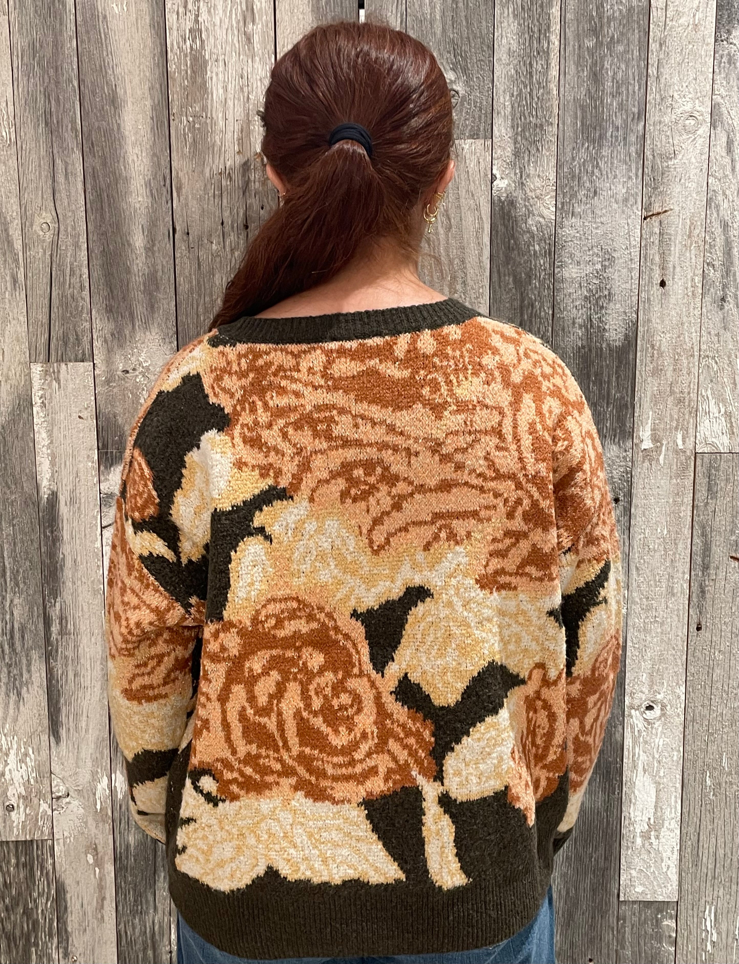 Oversized floral pattern in earthy fall tones of rust, mustard, cream, and olive