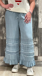 SELF FRAY WASHED CHAMBRAY PANTS -RUFFLE HEM -SIDE POCKETS -ELASTIC WAISTBAND WITH DRAWSTRING -EXPOSED SEAM AND FRAYED ACCENTS ON BOTTOM -100% Tencel