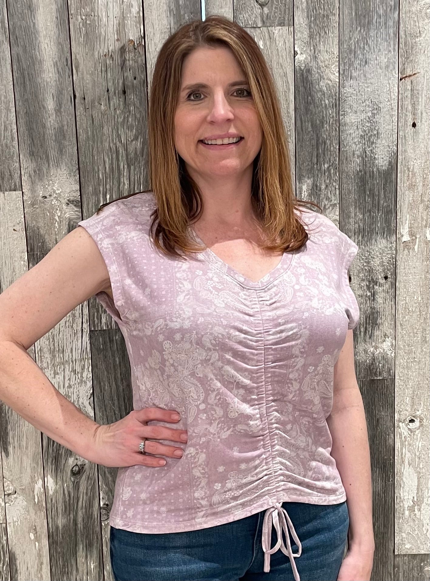 Color: Light lavender with a subtle white paisley and polka dot pattern