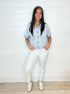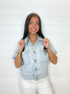 This boxy, button-front camp shirt in light wash denim is a unique find. With its short sleeves, front pockets, and laid-back design, it effortlessly combines style and comfort for a relaxed, trendy look. Perfect for adding a touch of individuality to your wardrobe.