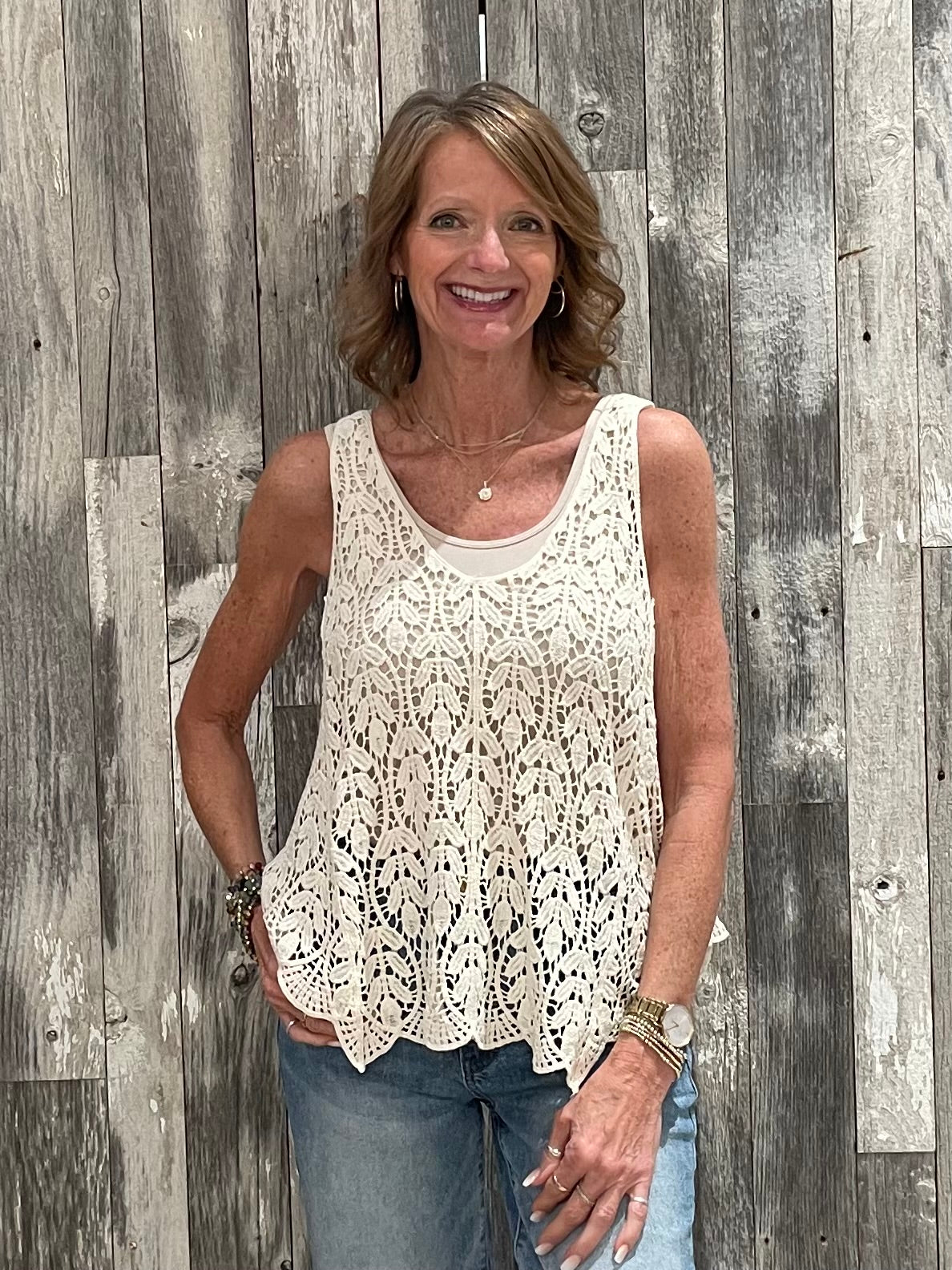 LEAF PATTERN CROCHET TANK TOP WITH SCALLOP HEM 75% COTTON/25% POLYESTER