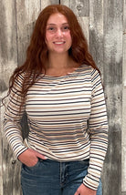 Classic Stripe Pattern: Horizontal stripes in neutral tones (black, tan, and cream) for timeless appeal.