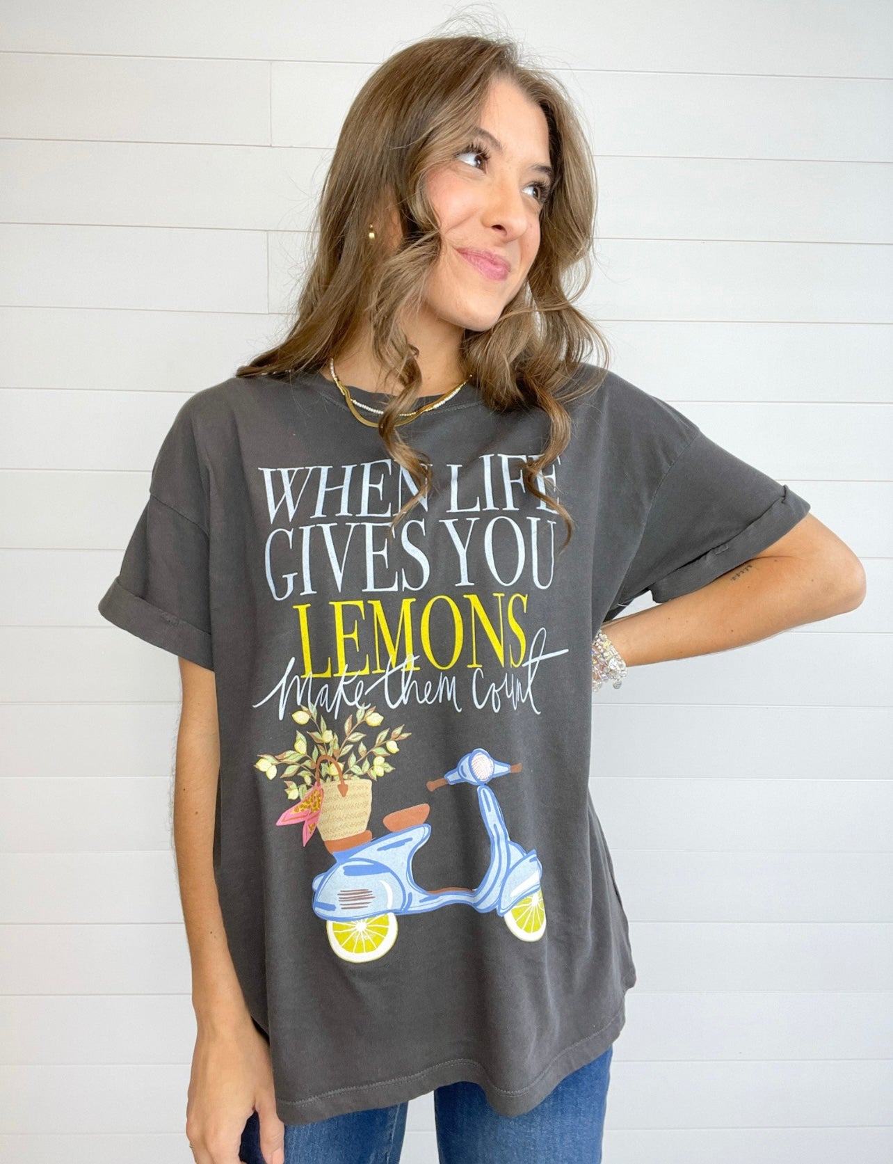 This sunny tee features a cheerful hand-drawn Vespa with lemons for wheels and the uplifting phrase: “When Life Gives You Lemons, Make Them Count!” Inspired by Mac and Marie’s travels to Sorrento, Italy—where lemon groves and charming scooters filled the streets—it’s your wearable reminder to stay positive and find joy in the everyday.