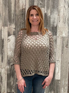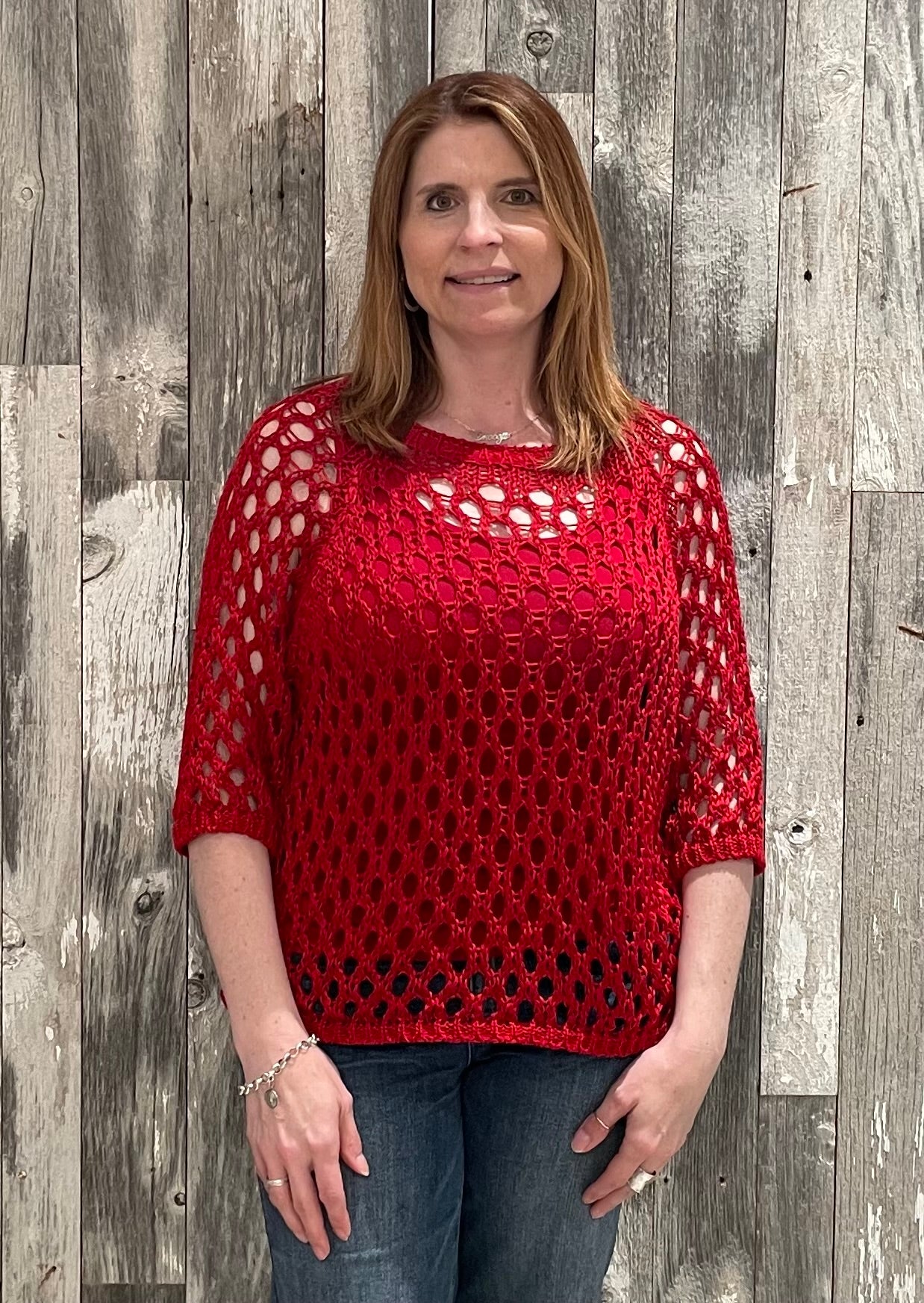 The sleeves are elbow-length and follow the same open-knit pattern as the body.