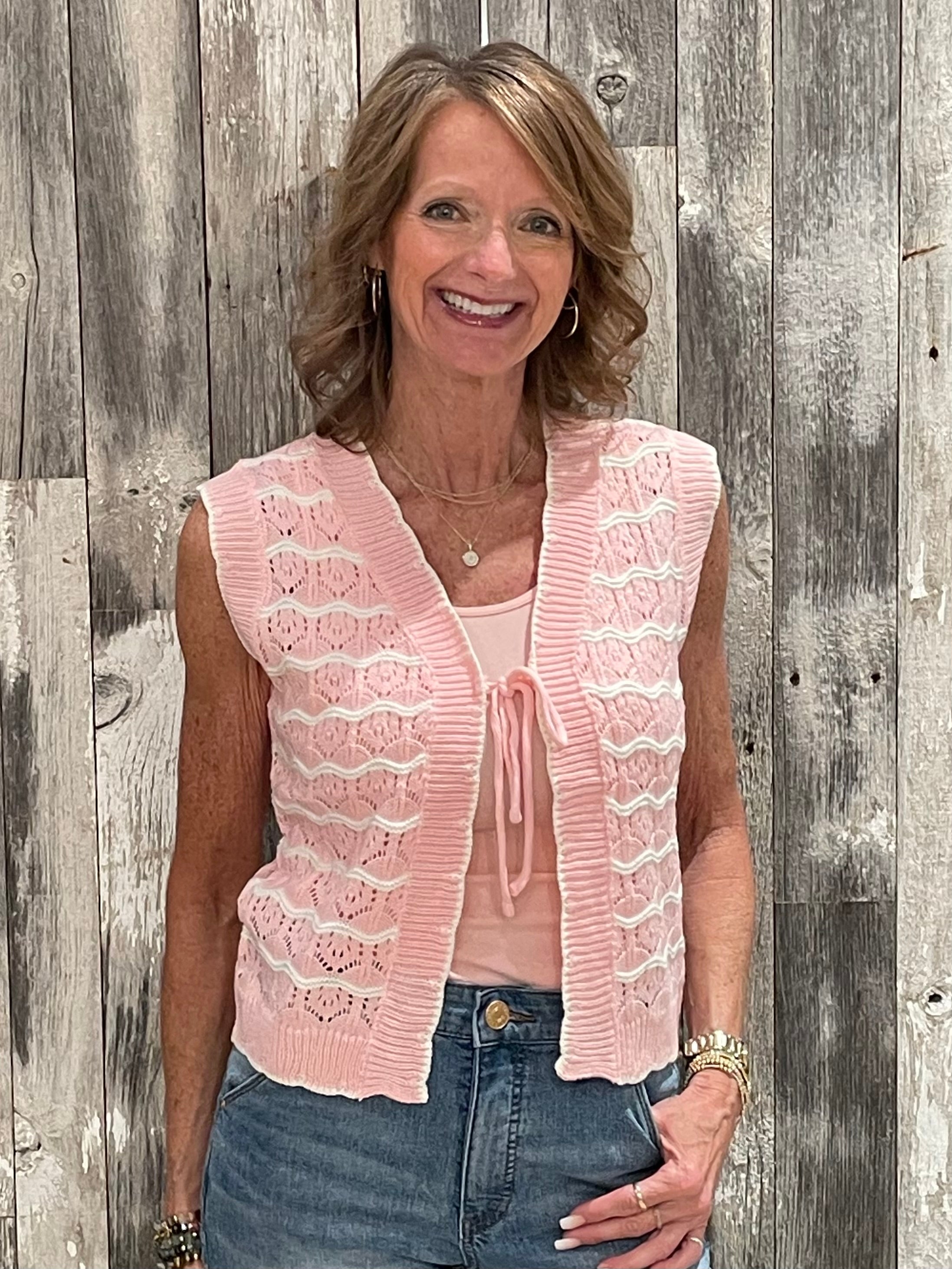POINTELLE LOW GAUGE SWEATER VEST WITH FRONT TIE 100%ACRYLIC