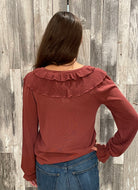 Fabric: Soft knit body with textured ruffle trim for contrast