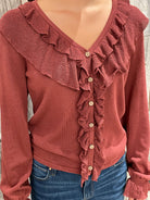 Neckline: V-neck with cascading ruffles along the placket and a ruffled yoke