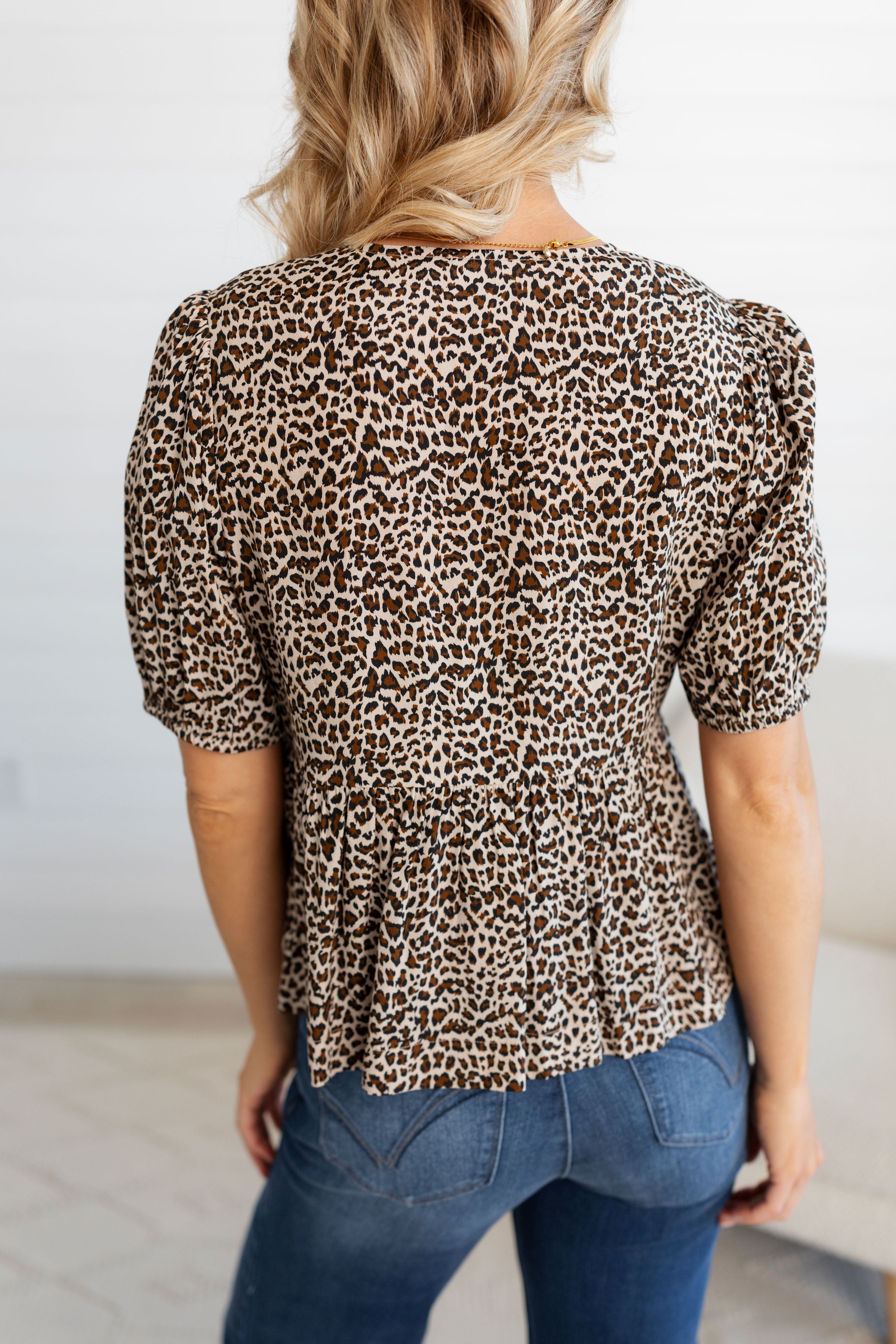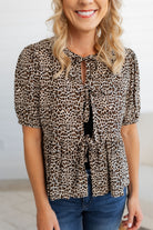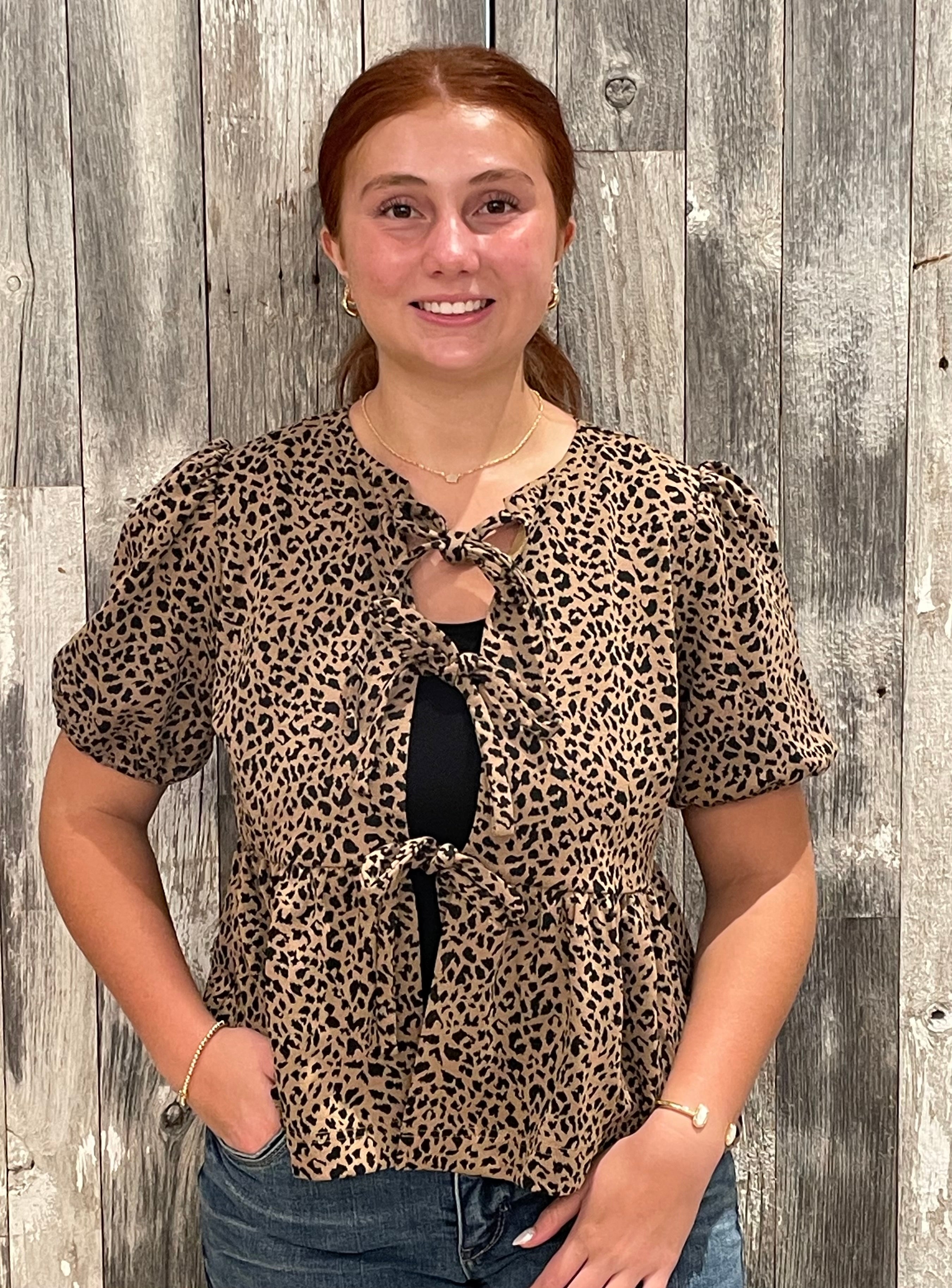 Print: All-over animal print (resembling leopard or cheetah pattern) in neutral tones