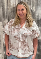 Print: Classic toile-style pastoral scene in warm sepia brown on a soft ivory background