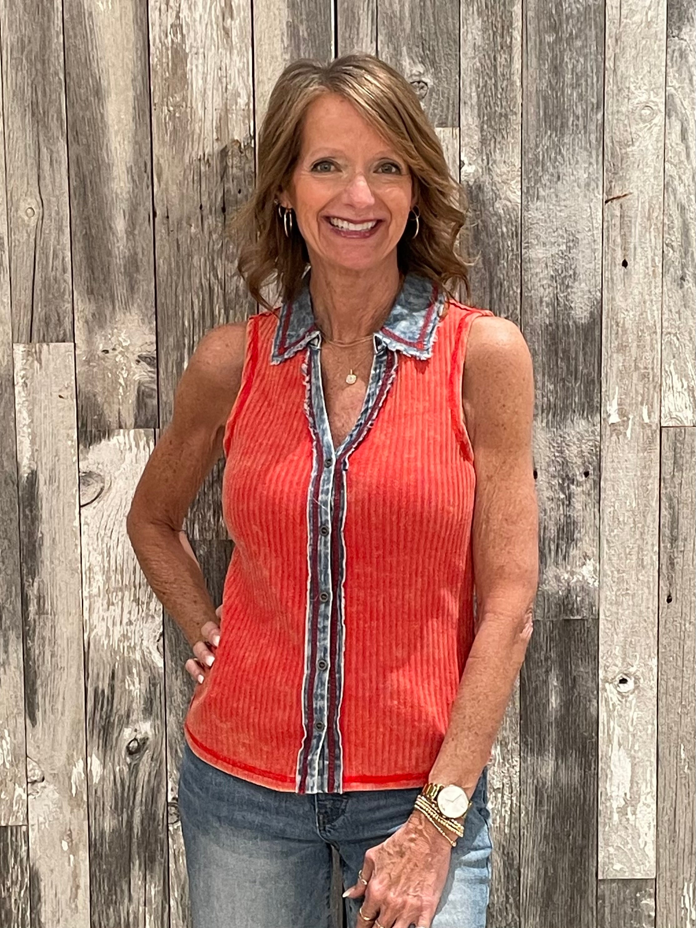 Washed Rib Thermal Sleeveless Button Down Top