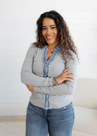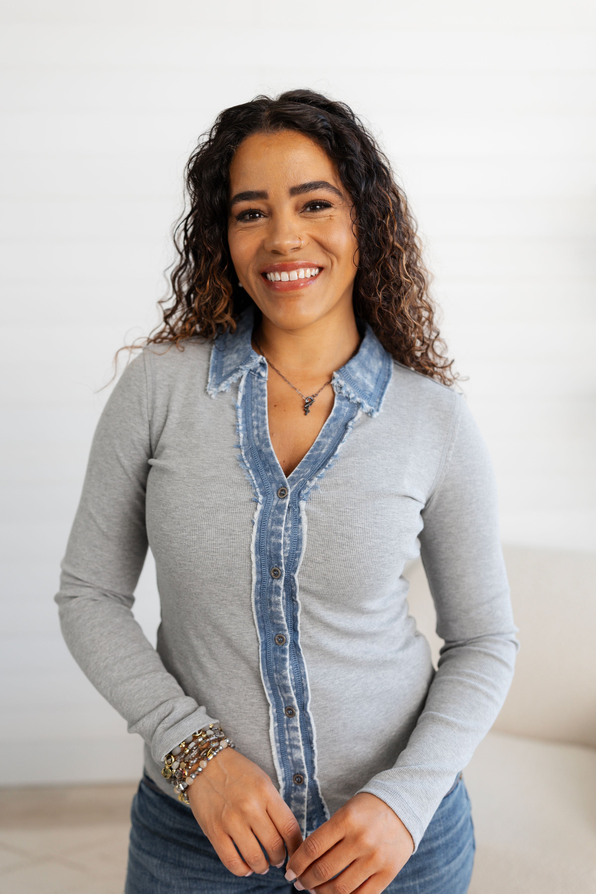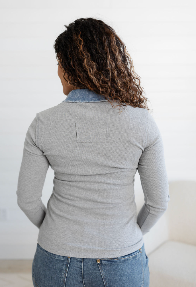 This button-down brings together cozy thermal texture with an unexpected twist—washed denim trim at the collar and placket. The ribbed knit adds movement and softness, while the denim gives it a little edge. A perfect not-so-basic for layering or wearing solo.