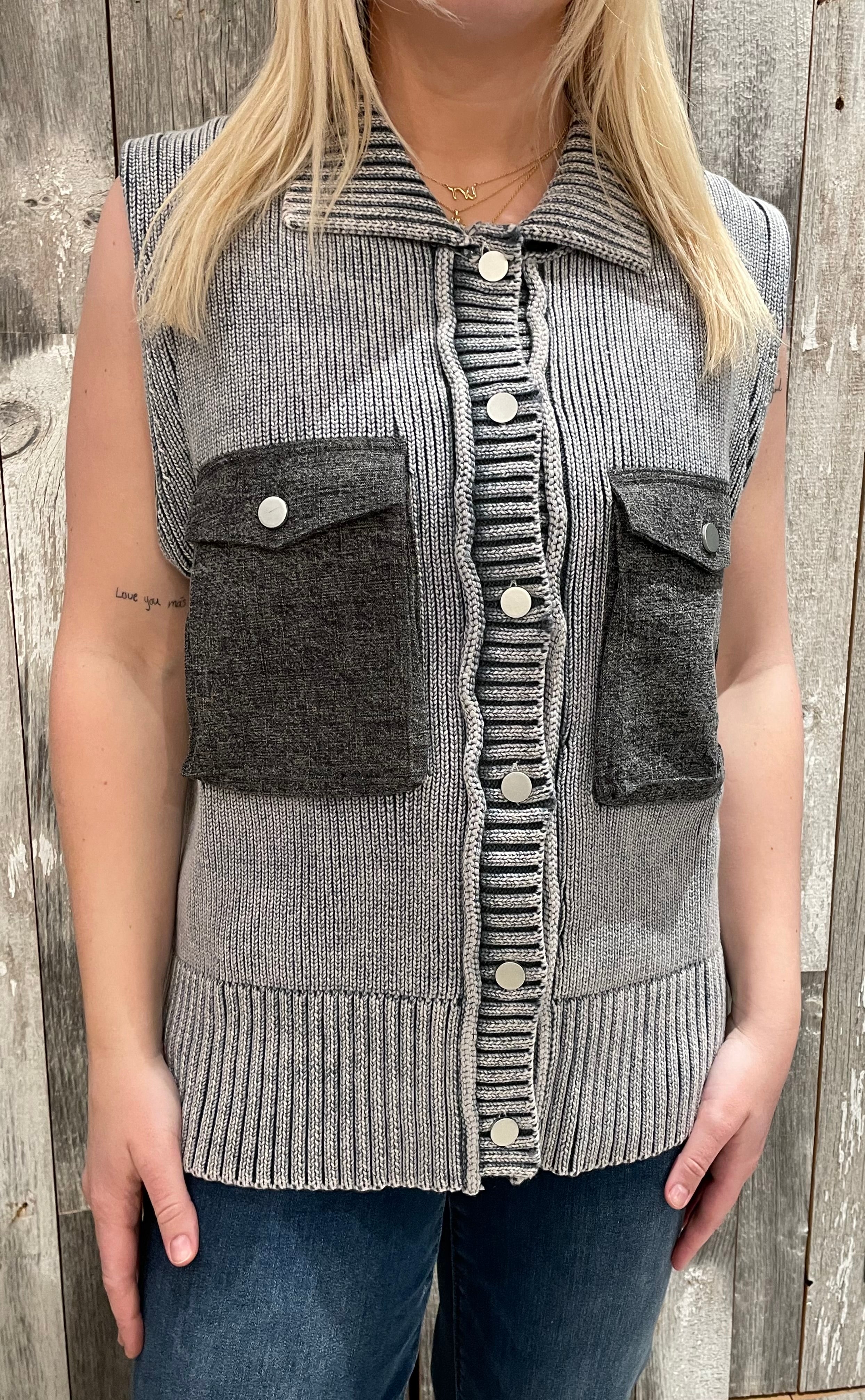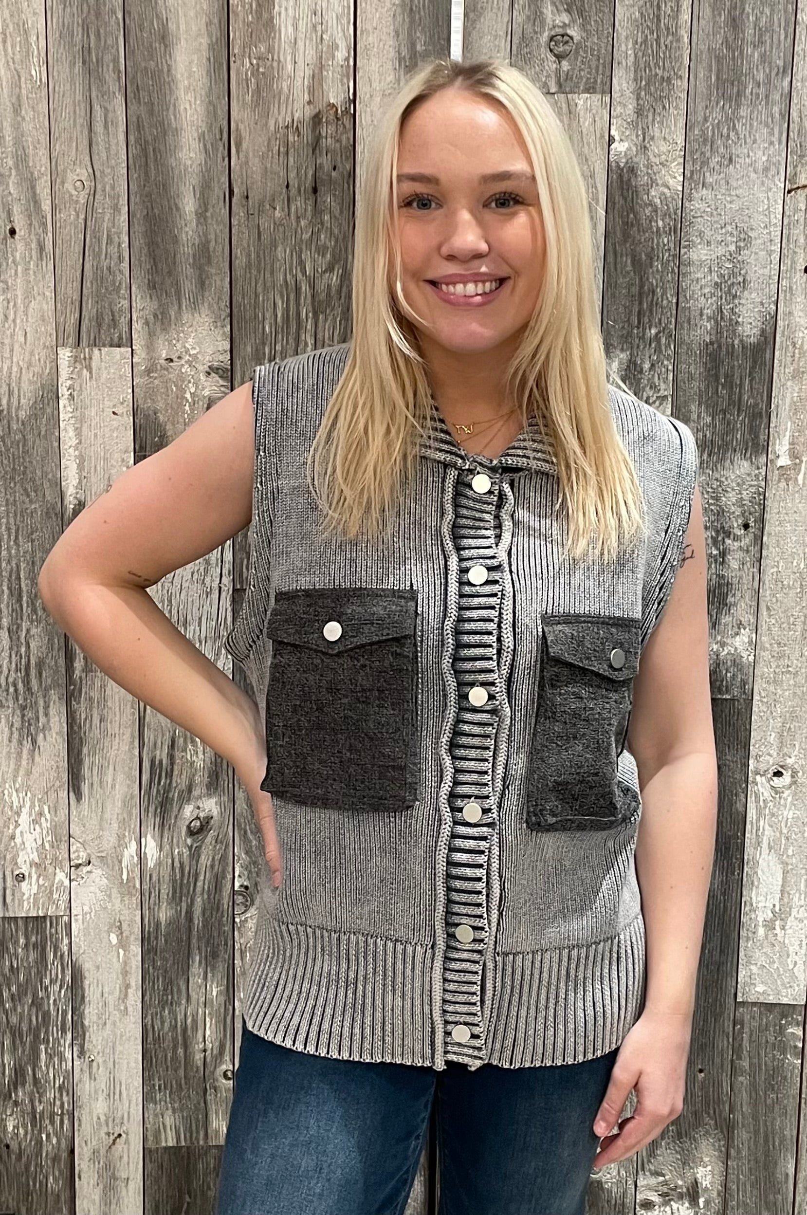 This Elan Knit Utility Vest is the ultimate throw-on piece for effortless, elevated style. Featuring a textured knit body with contrast pocket detailing, it blends cozy comfort with a structured, utility-inspired look. The collared neckline and button-front design give it a polished feel, while the sleeveless cut makes it perfect for layering through every season. Easy, versatile, and full of personality — this is the vest your customers will style a hundred different ways.